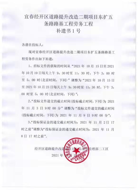 宜春经开区道路提升改造二期项目东扩五条路路基工程劳务工程补遗书1号